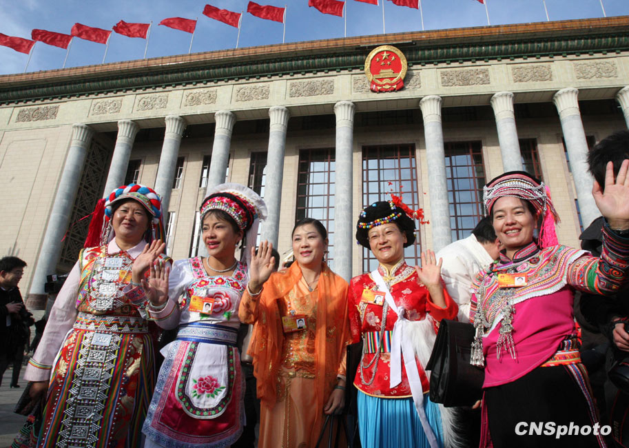 3月5日上午9时,十一届全国人大三次会议在北京隆重开幕。国务院总理温家宝作政府工作报告。图为少数民族女代表盛装出席人大开幕会。 中新社发 汤彦俊 摄