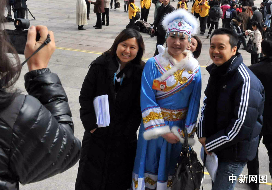 十一届全国人大三次会议3月5日在北京开幕,各民族人大女代表的服饰靓丽多彩,在天安门广场前大展英姿。 中新社记者 贾国荣 摄