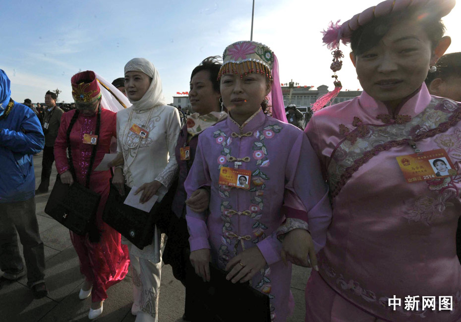 十一届全国人大三次会议3月5日在北京开幕,各民族人大女代表的服饰靓丽多彩,在天安门广场前大展英姿。 中新社记者 贾国荣 摄
