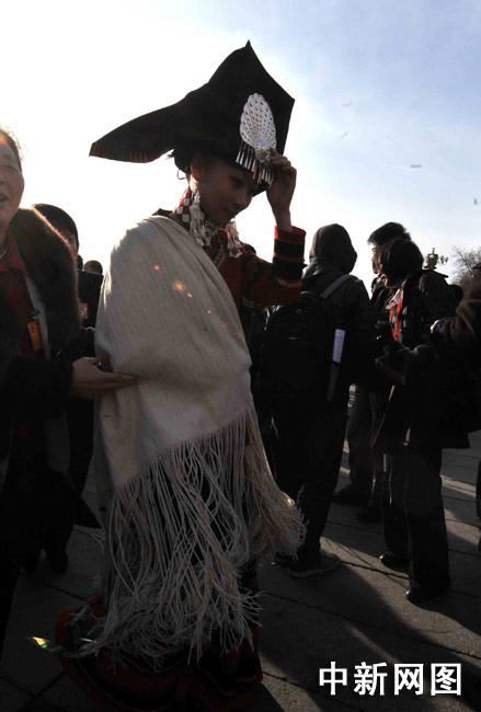 十一届全国人大三次会议3月5日在北京开幕,各民族人大女代表的服饰靓丽多彩,在天安门广场前大展英姿。 中新社记者 贾国荣 摄