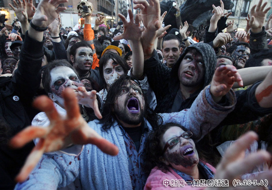 近日在西班牙马德里,众多爱好者装扮成“僵尸”的模样,在街头举行巡游活动。图片来源:中国新闻网>>点击观看详细内容