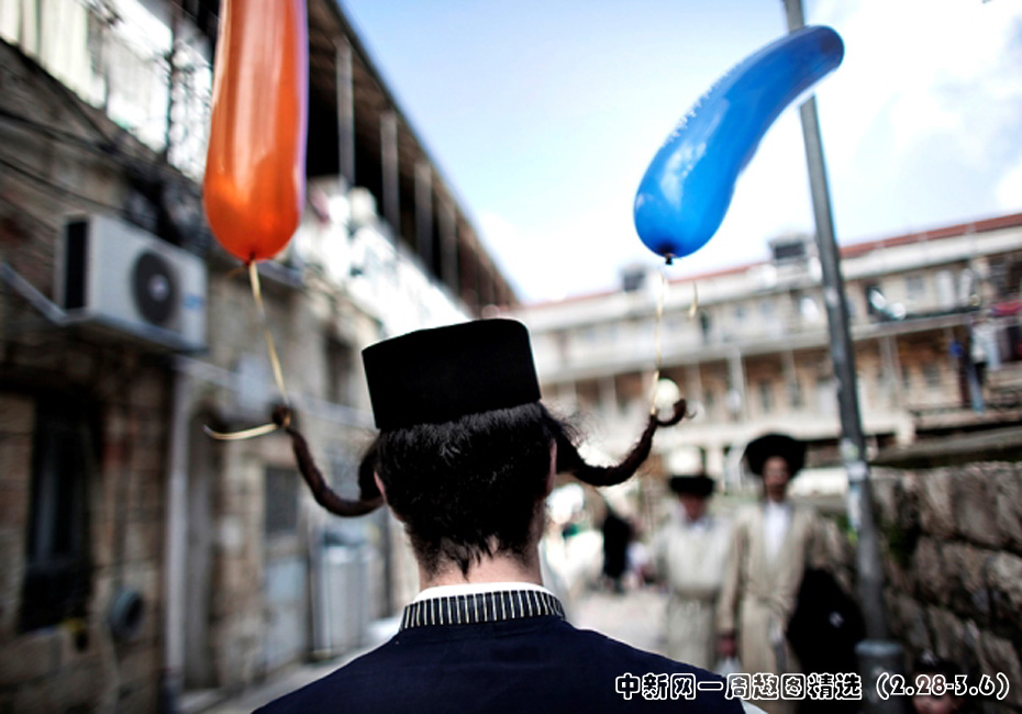 3月1日,耶路撒冷一名正统犹太教男子将气球绑在他的头发上庆祝普林节(Purim)的到来。这一节日是用来纪念犹太人从古波斯人的统治下获得解放。图片来源:中国新闻网>>点击观看详细内容