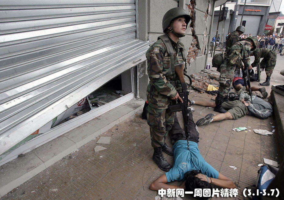3月2日,智利军警在街头维持秩序。智利总统巴切莱特当日说,政府派往灾区维持治安的军人数量已达14000人,地震重灾区的抢劫现象已得到控制。图片来源:中国新闻网
