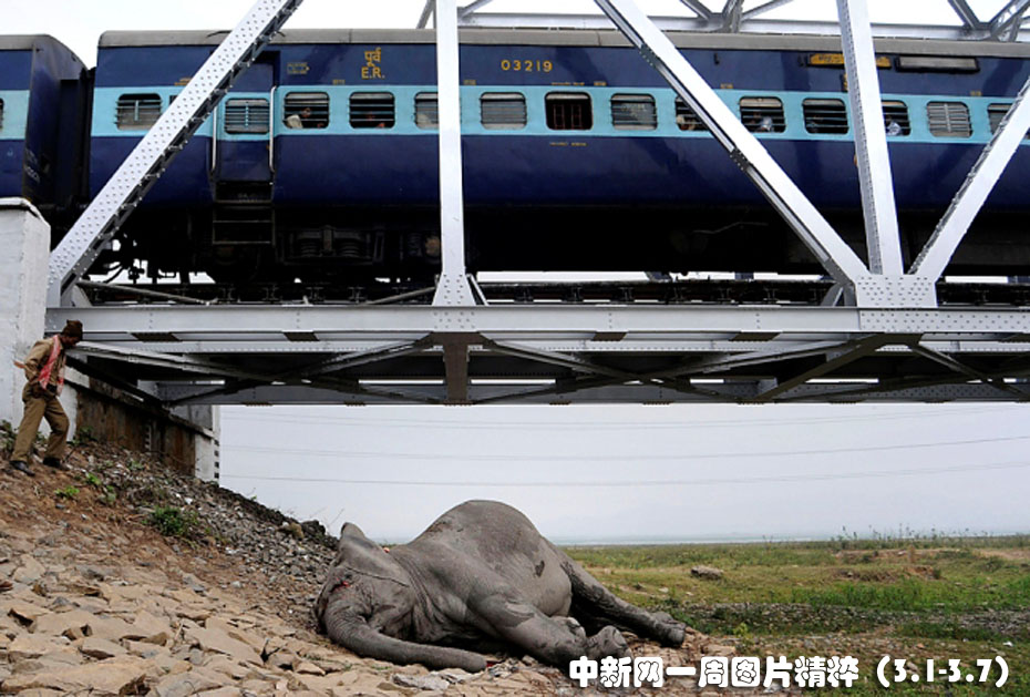 近日,印度高哈蒂的地坡湖野生动物保护区,一名警察正在查看一头被火车撞死的大象。另有一头怀孕大象生下一头小象后带着重伤逃离现场。工作人员救了这头小象。图片来源:中国新闻网
