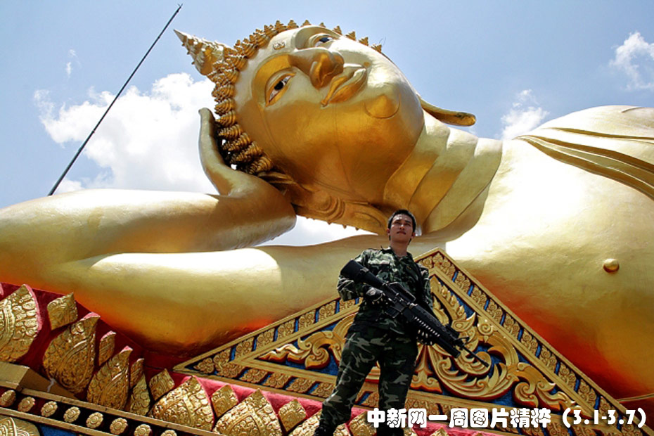 3月4日,在泰国也拉府的一所寺庙中,一名士兵持枪站在一尊佛像前,确保寺庙在动荡中不受损害。图片来源:中国新闻网