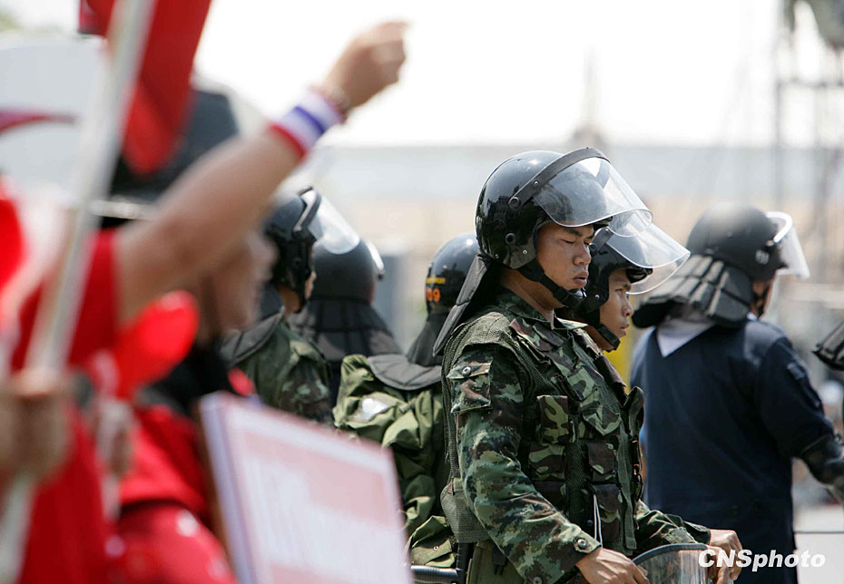 3月13日起,泰国“红衫军”陆续从泰国北部、东北部等外府进入曼谷市,在集会主会场搭设演讲舞台和帐篷,拉开大规模示威序幕。图片来源:中国新闻网