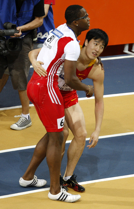 在14日晚间结束的多哈室内田径世锦赛60米栏决赛中,刘翔仅仅以7秒65的成绩获得第七名。古巴选手罗伯斯则以7秒34成绩夺得冠军并打破室内世锦赛赛会纪录。图片来源:中国新闻网