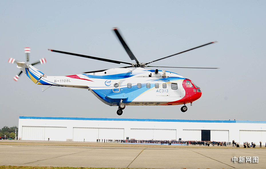3月18日上午,中国首架大型民用直升机AC313在江西省景德镇市成功首飞,标志着中国和美、欧、俄一样具备了自主研制大型直升机的能力。图片来源:中国新闻网