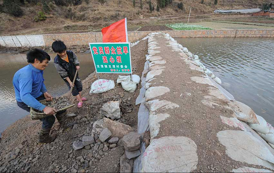 云南省曲靖市宣威市龙潭镇村民正在加固水坝,蓄水抗旱(3月5日摄)。图片来源:新华网 秦晴 摄