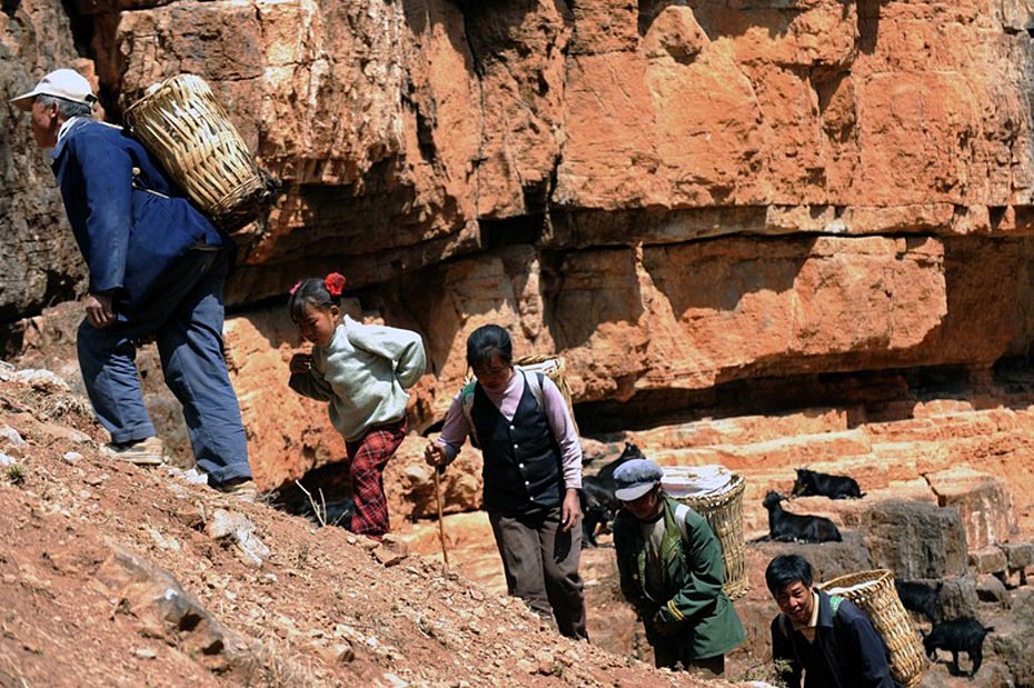 村民背着水走在陡峭的山崖上(3月7日摄)。村民需要背着几十公斤重的水桶,从海拔1000多米的江边,小心翼翼地往海拔1800多米的村中跋涉。图片来源:新华网 秦晴 摄