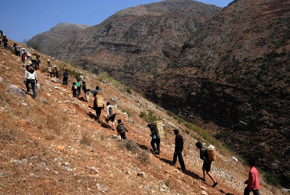 村民背着水走在陡峭的山崖上(3月7日摄)。村民需要背着几十公斤重的水桶,从海拔1000多米的江边,小心翼翼地往海拔1800多米的村中跋涉。图片来源:新华网 秦晴 摄