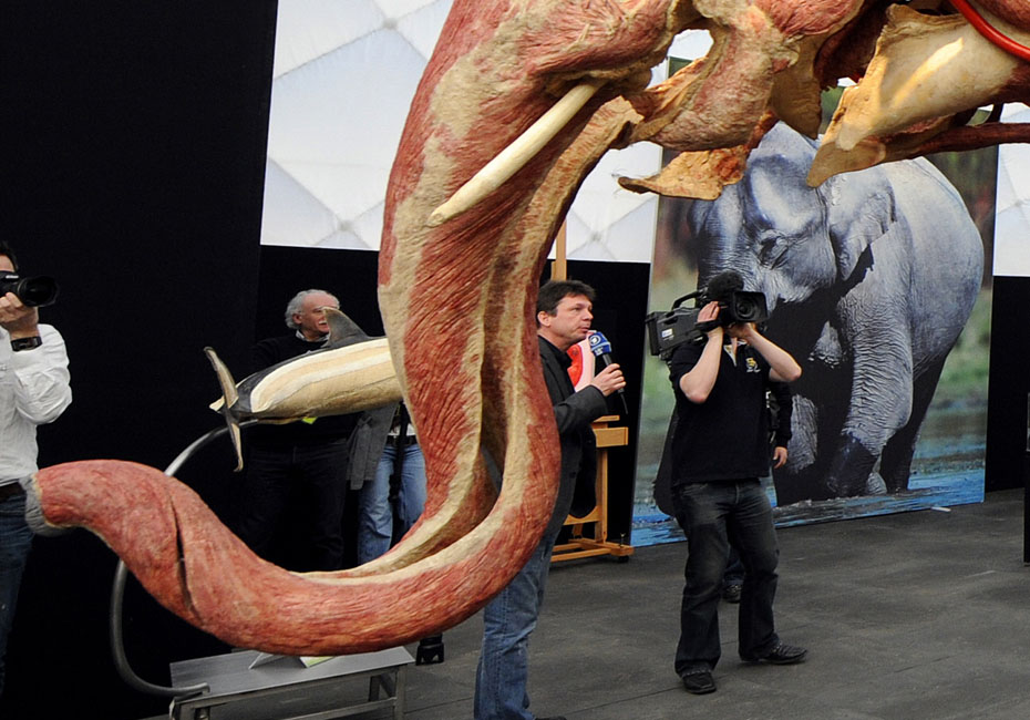 3月18日,德国解剖学家巩特尔·冯·哈根斯目前正在展出有史以来的最大的尸体,一只生前在德国萨尔州诺因基兴动物园很受欢迎的名为“桑芭”的母大象。 图片来源:中国新闻网