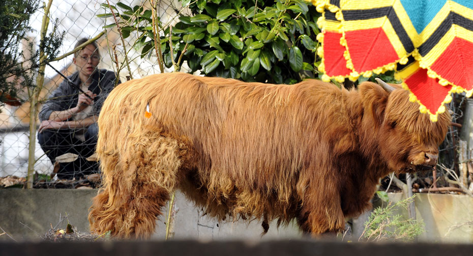 3月18日,德国一头苏格兰高地牛来到一居民院内懒洋洋的晒太阳,最后经过兽医的麻醉和消防员协力才将这头蛮力十足的家伙“制服”。图片来源:中国新闻网