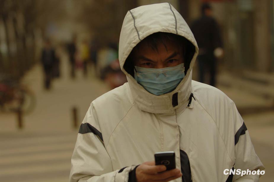 3月20日,春季首场重度浮尘天遮盖了整个北京城。图为北京市民在街头“全副武装”。中新社发 邹宪 摄