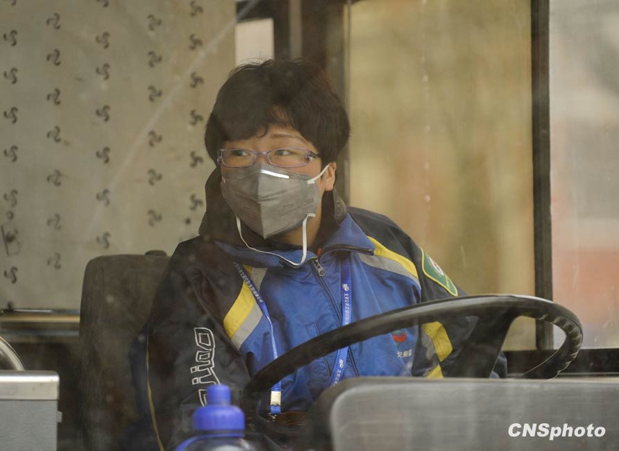 3月20日,春季首场重度浮尘天遮盖了整个北京城。图为一位公交车司机戴上防尘口罩。中新社发 廖攀 摄