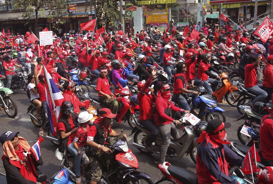 泰国红衫军20日号召数千辆汽车上街,在曼谷大游行,路线总长约45公里,横跨曼谷多条主要街道,势要瘫痪曼谷。图片来源:中国新闻网