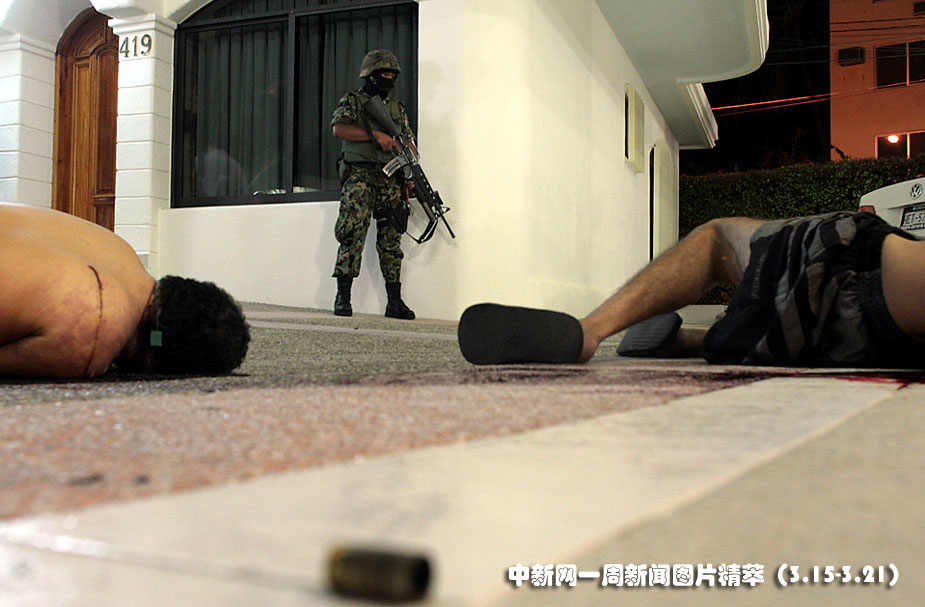 15日(周一),在墨西哥阿卡普尔科一家酒店内,两名涉嫌贩毒人在一场枪战中身亡。一名墨西哥士兵正在把守现场。