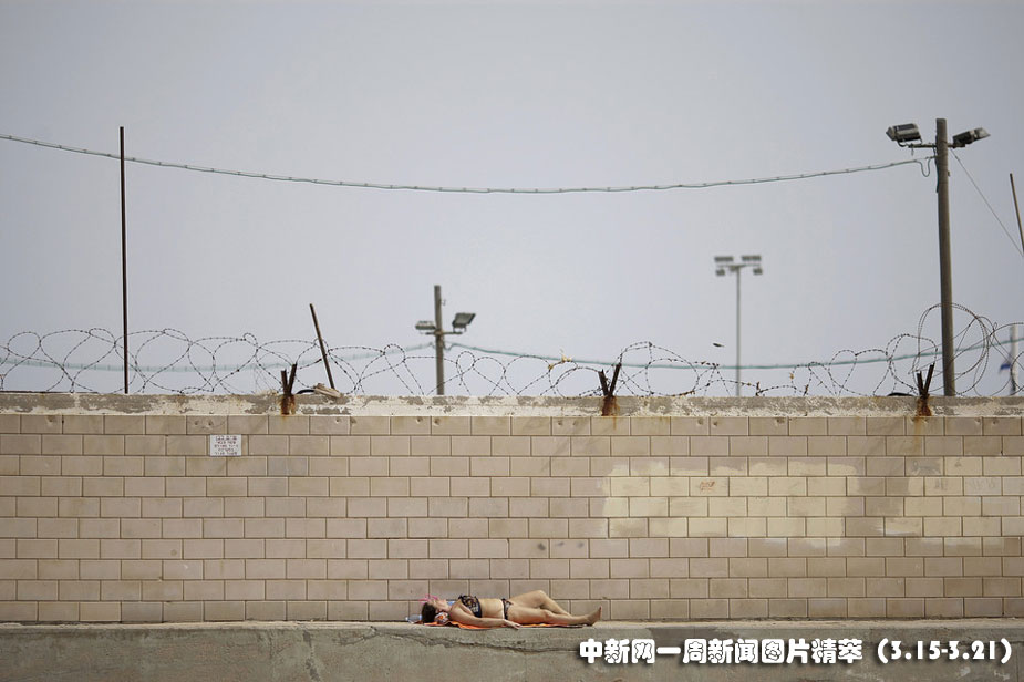 15日(周一),以色列一位女性在海法海军军事基地外的海滩上晒日光浴。