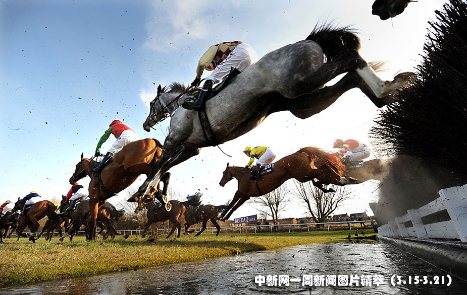 16日(周二),在英国切尔滕纳姆节冠军障碍赛上,众多赛马正在冲过障碍。