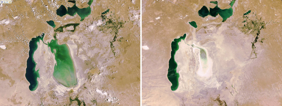 2009年7月10日欧洲航天局公布的照片显示了号称世界第四大内陆水体的咸海从06年至09年海岸线急剧回落的过程。咸海的消失其实是人类无度开发利用水资源行为的恶果。