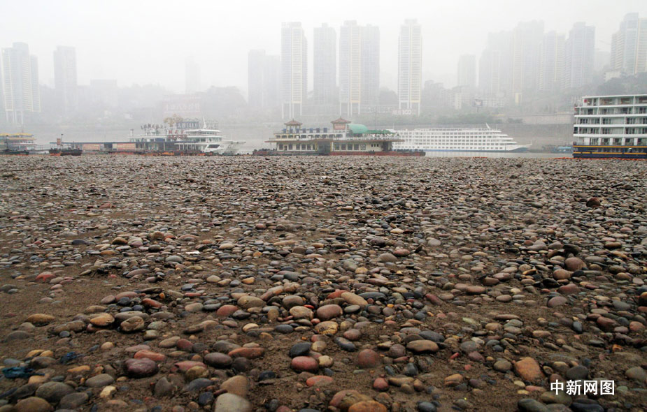 中新网重庆3月23日电 受去冬今春西南地区干旱影响,长江、嘉陵江重庆段水位持续下降。3月23日,记者在重庆市朝天门嘉陵江与长江交汇处看到,大面积河床裸露出来,部分水段已见底。据相关部门通报,截止3月22日,长江重庆段水位退落至0.31米,比去年同期低了近2米。孟幻 摄