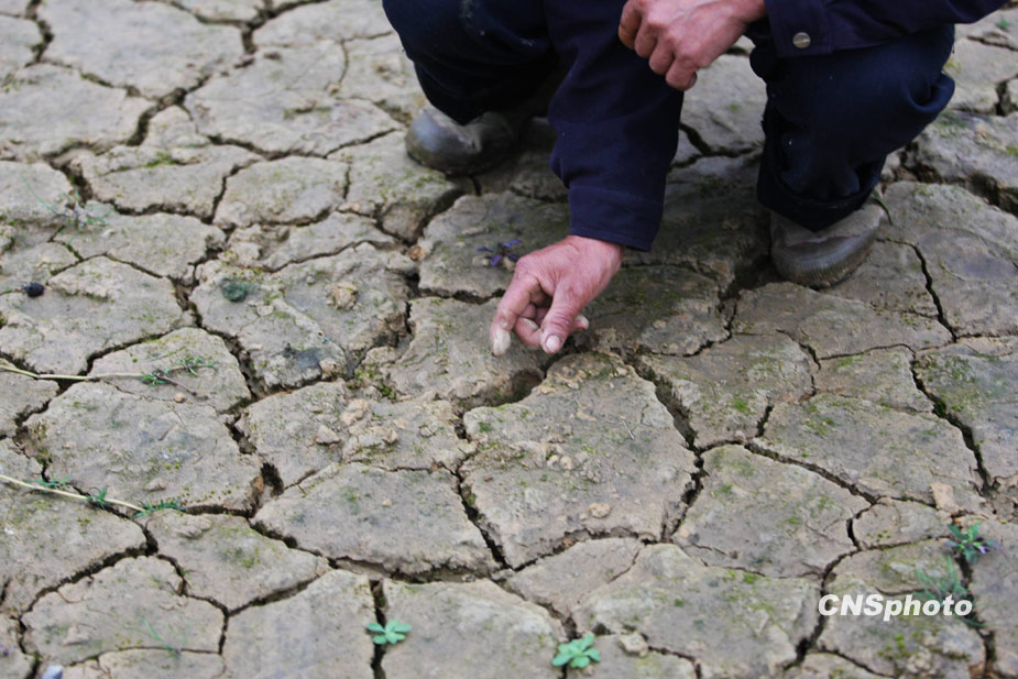 3月23日,重庆武隆县玉荷村一座水塘已完全干涸,原本池底的淤泥干裂成块。重庆武隆县自去年入冬以来,相继遭受冬干春旱,塘库蓄水量剧减,人饮蓄水池干枯,溪沟断流。目前,该县部分水库出现枯竭状况,14.95万人饮水困难,占总人口的37%。预计到4月中旬,武隆饮水困难人口将达到18万人。中新社发 郭晋嘉 摄