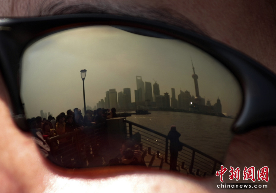 一个戴太阳眼镜的外国游客,参观上海外滩。