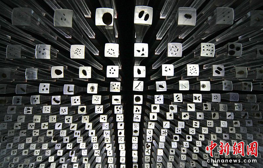 上海世博会筹办工作已进入最后冲刺阶段,在世博建设者的努力下,放眼浦江两岸的世博园区,星罗棋布的外国国家馆、企业馆和城市最佳实践区案例馆各具特色,争奇斗艳。图为由60686根蕴含植物种子的透明亚克力杆组成的世博会英国馆内景。丁晓春/CFP
