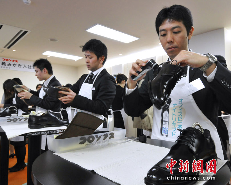 4月1日,日本一家鞋油厂新员工在入职仪式上为老员工擦鞋。图片来源:中国新闻网