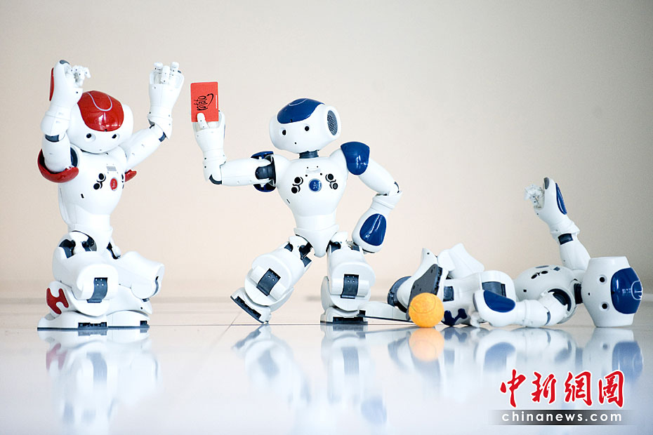 机器人足球队在英国爱丁堡国际科学节亮相,它们由爱丁堡大学研制而成。机器人足球队员内置处理器可以感受周围的环境和其他机器人的反应。图片来源:中国新闻网