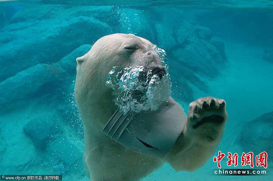 美国Asheboro北卡罗来纳动物园一头名叫威利的北极熊可是个“活宝”。任何一个可用的东西都能成为它在镜头前“耍宝”的玩具。图片来源:CFP