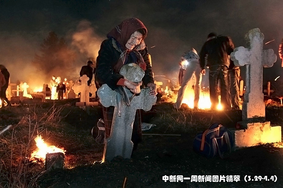 周四(1日),在罗马尼亚弗鲁穆沙尼(Frumusani)的棕枝主日(Palm Sunday)上,人们在墓地里燃起火焰,献祭食物来悼念他们已故的亲人。图中,一位老妇倚靠在一块十字形石碑上悼念埋藏在此的亲人。