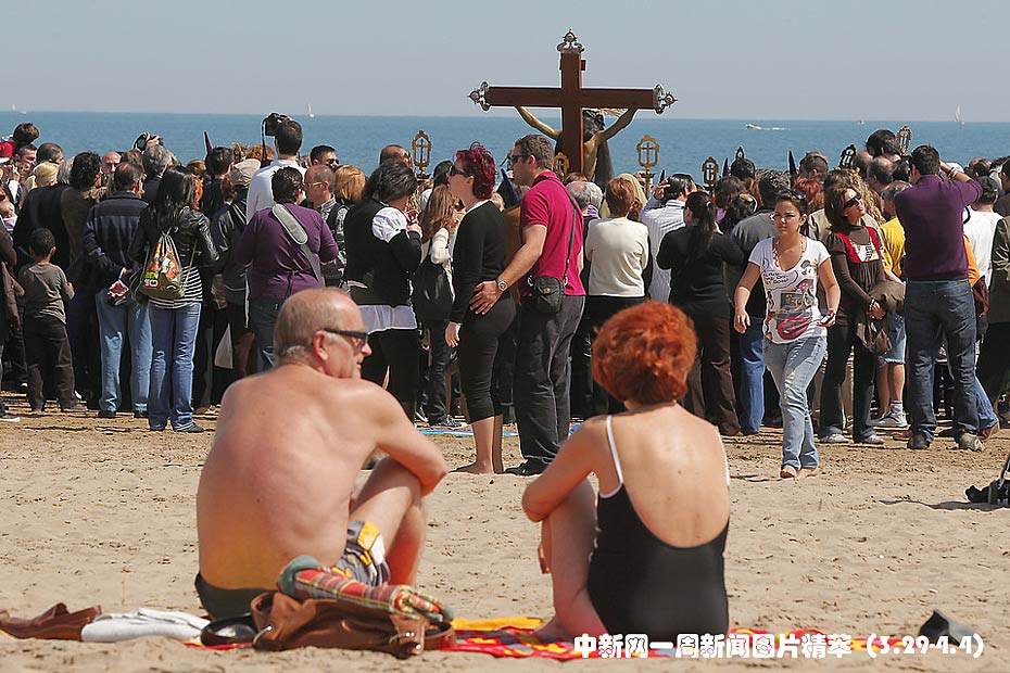 周五(2日),西班牙巴伦西亚,人们在海滩举行复活节游行。
