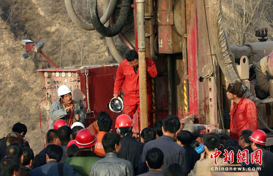 4月2日下午,华晋焦煤公司王家岭矿透水事故抢险人员为井下有生命迹象的2号垂直钻孔输送营养液,并静听井下人员反馈回音。中新社发 张云 摄