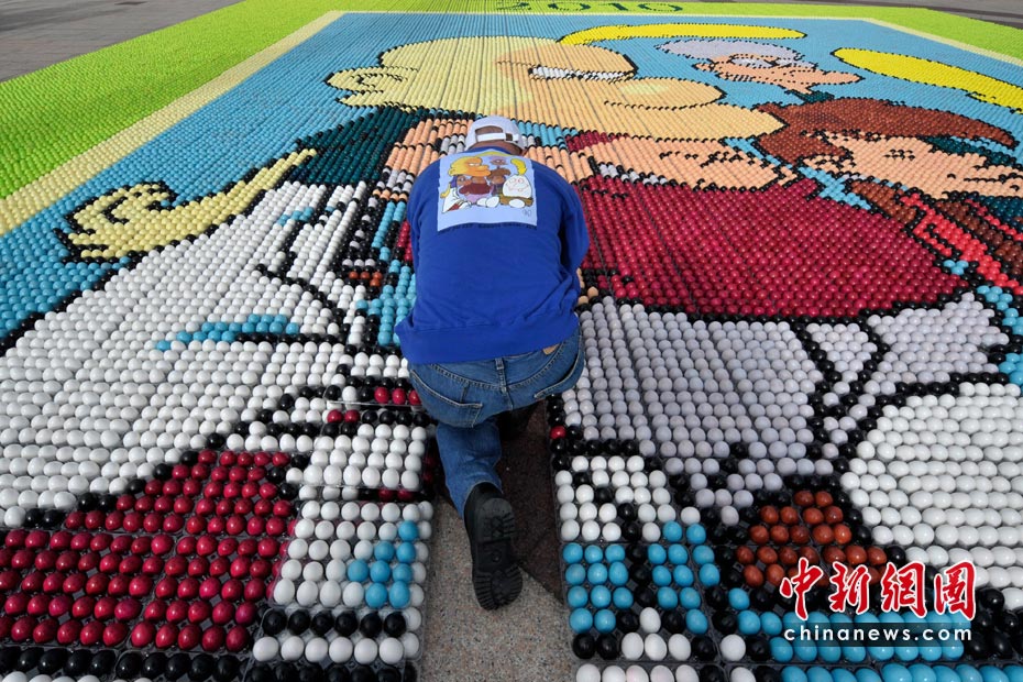 4月4日,瑞士洛桑的广场上,人们用6.6万枚彩蛋拼出一画巨大的卡通图像,用来为患癌症儿童筹集善款。图片来源:中国新闻网