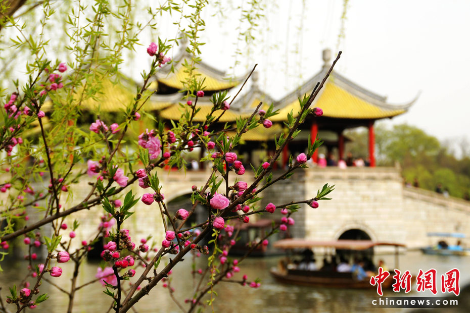 明媚的春光下,古城扬州已到桃红柳绿时。清明假期,水、柳、花构成的扬城美景,每天都让数万游客陶醉其中。中新社发 潘多拉 摄