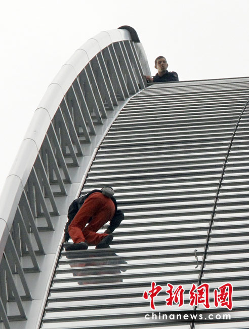 4月7日,巴黎,法国“蜘蛛人”罗伯特当日用了大约50分钟成功攀爬185米高的法国燃气苏伊士集团大楼。 图片来源:中国新闻网