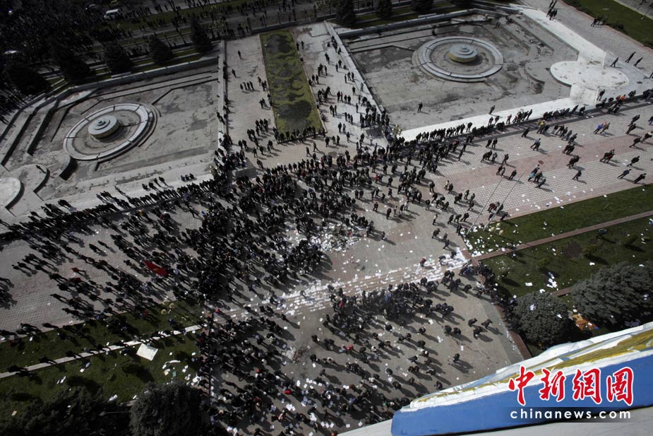 吉尔吉斯斯坦7日发生大规模骚乱,反对派示威者占领了议会大楼,8日,总统府也被示威者占领。图为示威者聚集在总统府门前。