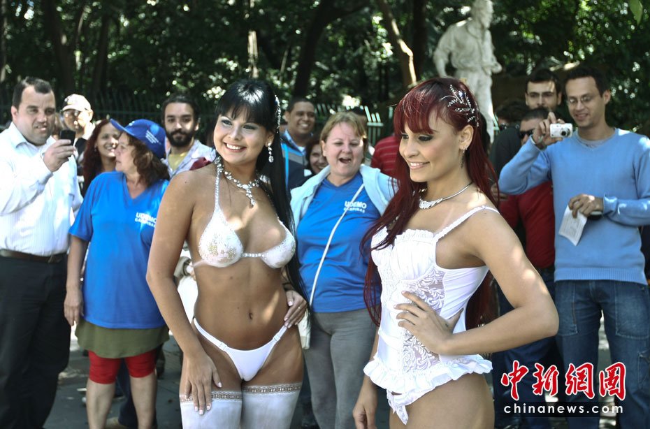 4月8日,巴西模特身着内衣在圣保罗大街走秀,宣传第16届巴西情趣用品博览会。图片来源:中国新闻网