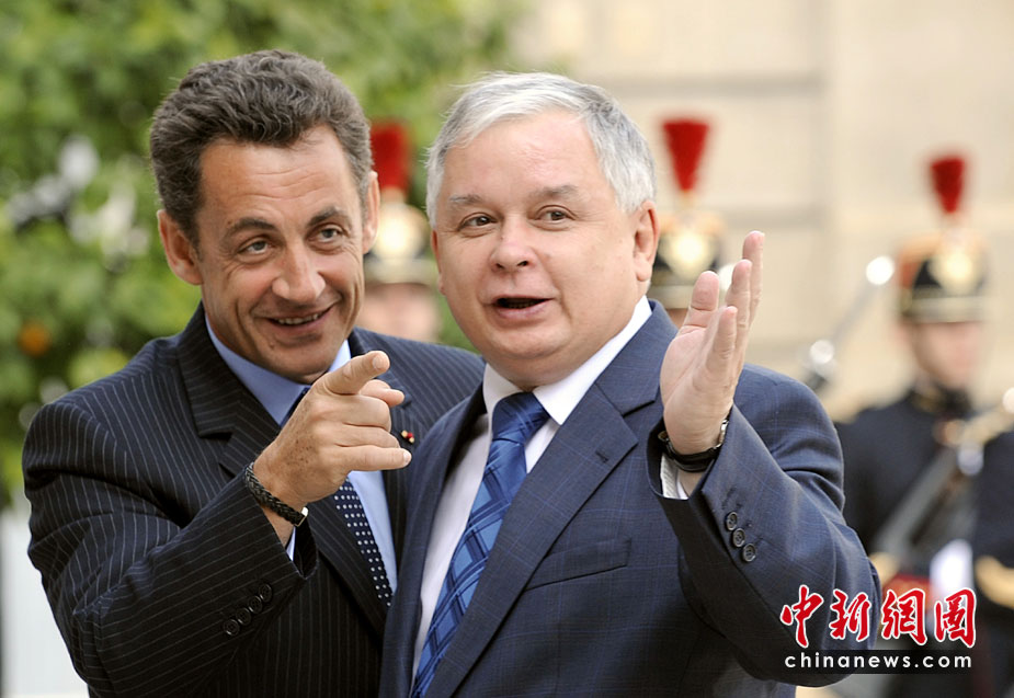 波兰总统卡钦斯基乘坐的一架图-154飞机10日在俄罗斯斯摩棱斯克州北部一军用机场降落时失事,至少87人死亡。卡钦斯基本人被确认身亡。图为2007年波兰总统卡钦斯基与法国总统萨科奇。