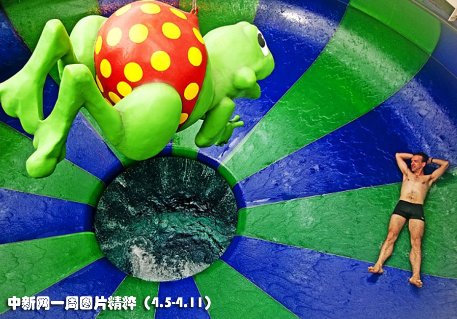 4月5日周一,在荷兰瓦森纳Duinrell游乐园中,一位游客正躺在一个名为Tikibath的泳池中享受戏水的乐趣。