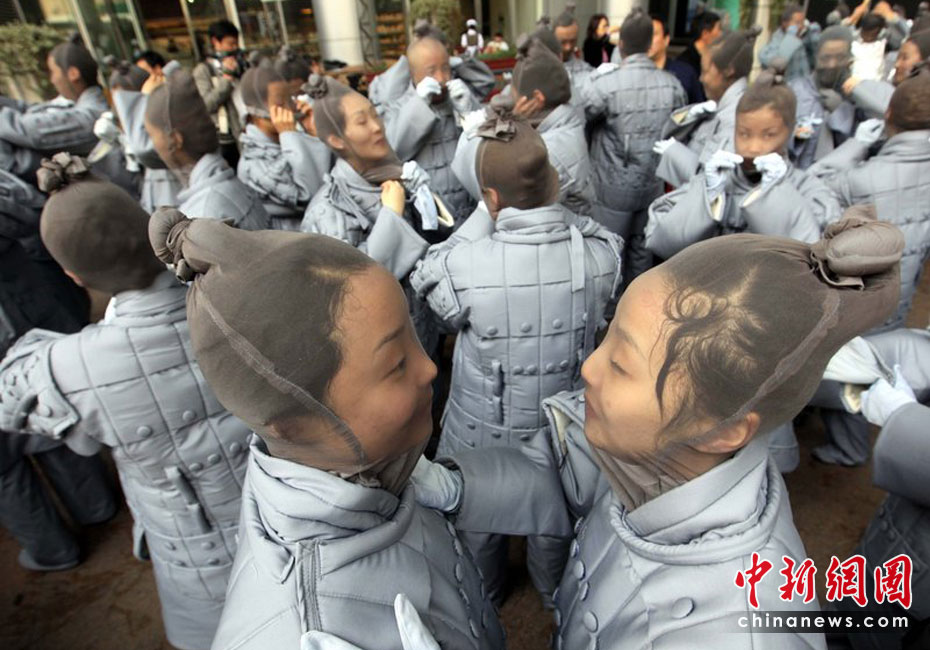 4月10日,由西安旅游局承办的兵马俑牵手上海世博会大型旅游宣传咨询活动举行。来自兵马俑故乡的百人表演队伍,身着灰色的兵马俑服装,以铿锵的节奏、雄壮的气势,在上海南京东路步行街和东方明珠广场游演,吸引了大批市民及海内外游客驻足观看。文音/CFP