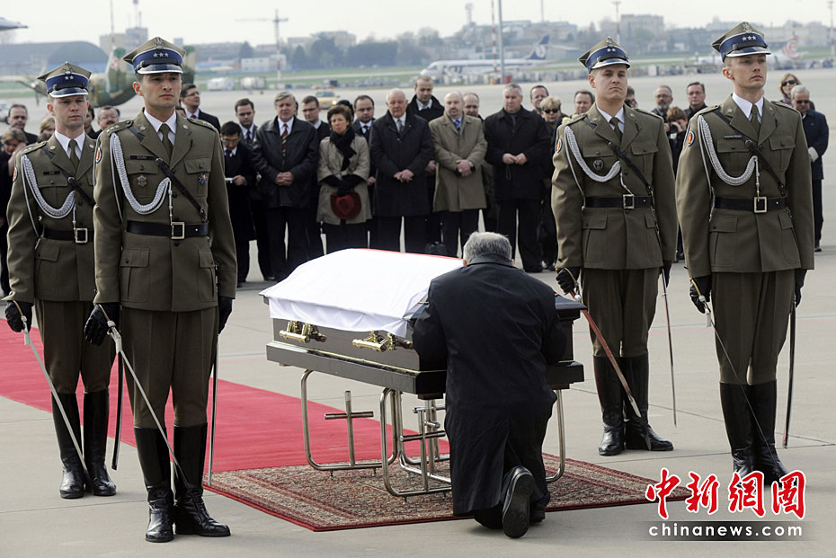 4月10日,卡钦斯基乘坐专机从华沙飞往俄罗斯斯摩棱斯克市,参加卡廷森林事件70周年纪念活动。途中飞机在斯摩棱斯克“北方”军用机场附近降落时失事,共造成包括卡钦斯基夫妇及众多政府高官在内的96人死亡。惨剧发生后,举世震惊。图为卡钦斯基的孪生兄弟在遗体前跪拜。