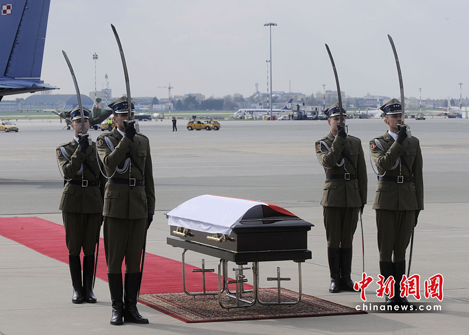 4月10日,卡钦斯基乘坐专机从华沙飞往俄罗斯斯摩棱斯克市,参加卡廷森林事件70周年纪念活动。途中飞机在斯摩棱斯克“北方”军用机场附近降落时失事,共造成包括卡钦斯基夫妇及众多政府高官在内的96人死亡。惨剧发生后,举世震惊。图为卡钦斯基的遗体抵达华沙。
