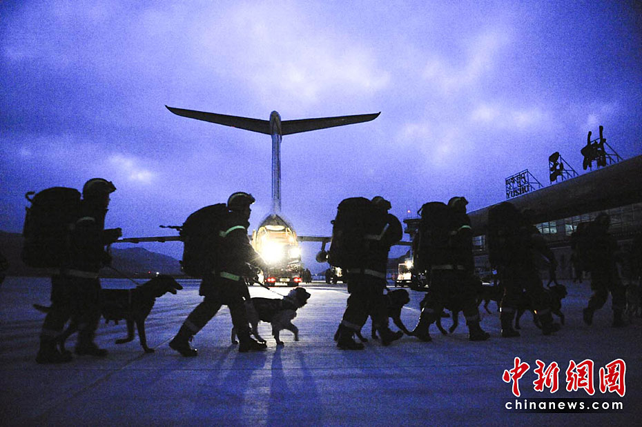 图为4月14日20点20分,中国国际地震救援队抵达玉树机场。中新社发 廖攀 摄