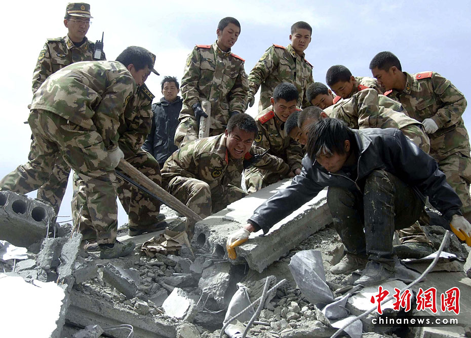 图为4月14日,武警玉树支队的战士和玉树当地民众共同救援被困的民众。中新社发 于文群 摄