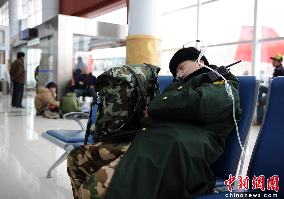 15日青海玉树地震救援进入第二天,各方救援人员不断赶来。由于玉树县海拔高达4000米,许多外地救援者一时难以适应。记者救援现场了解到,一些救援者出现身体不适,而目前灾区又缺乏抗高原反应药物。图为一位救援人员在玉树机场大厅吸氧。中新社发 符永康 摄