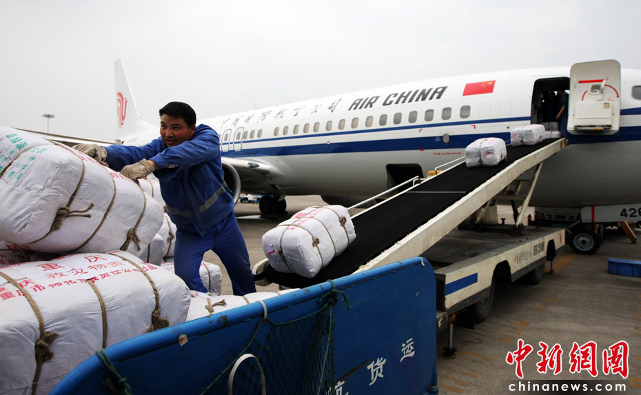 4月15日,重庆江北国际机场停机坪上,工人们紧张地将救援物资装运上飞机准备起运青海地震灾区。青海玉树县地震发生后,中共中央政治局委员、重庆市委书记薄熙来庚即作出重要批示,要求重庆全力以赴支援灾区,根据灾区需求提供支援。中共重庆市委、市政府第一时间向青海省政府发去了慰问电,并支援灾区300万元和大批救援物资,首批救援物资于当日下去从重庆起飞空运至灾区。中新社发 郭晋嘉 摄
