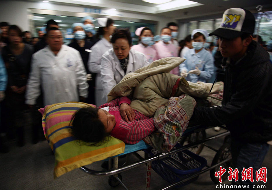 4月15日下午5时40分,首批青海玉树地震伤员被送往四川省人民医院进行治疗,这批伤员于15日下午5时许随着中国空军运输机抵达成都,每位伤员均有亲人、家属陪同。图为即将被送进急救中心的地震伤员。中新社发 张浪 摄