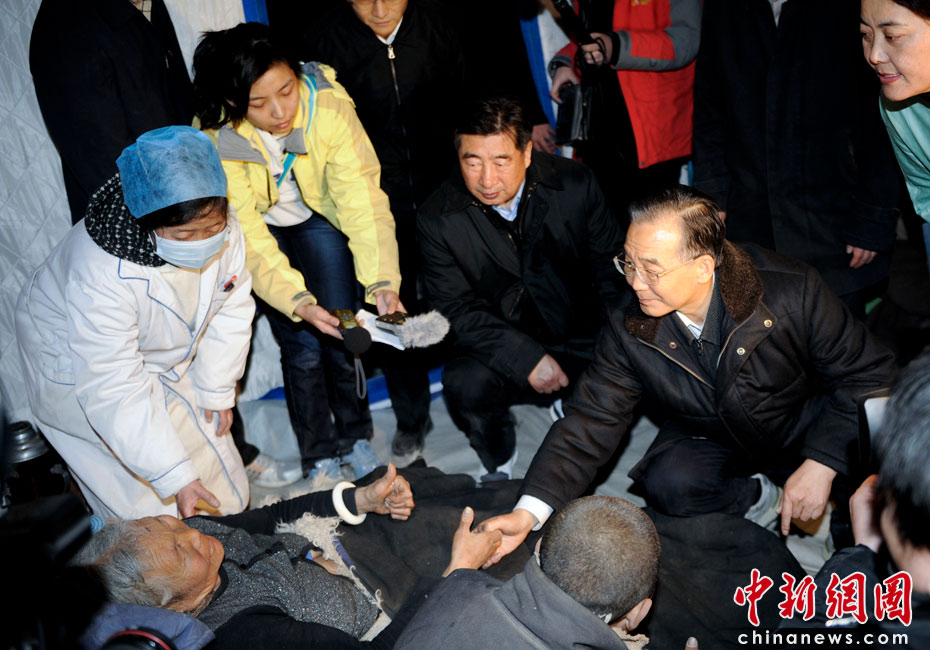 4月15日20时,中国国务院总理温家宝来到青海省玉树县玉树自治州医院看望受灾民众。这是温家宝握着一位藏族大妈的手问候其身体情况。国务院副总理回良玉、国务委员孟建柱参加看望慰问。中新社发 廖攀 摄